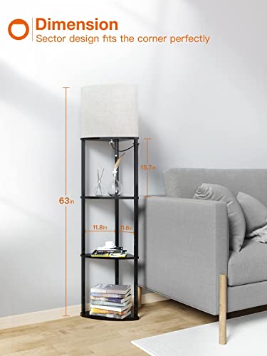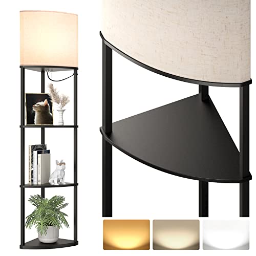 addlon 4-Tier Sector Corner Shelf Floor Lamp with 3 Color Temperatures LED Bulb and White Display Lamp Shade with Shelves for Living Room, Bedroom and Office – Black