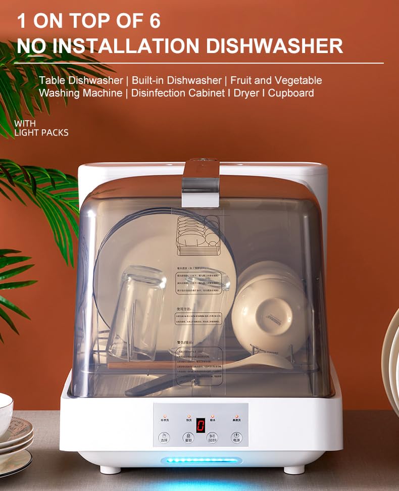 Introducing our portable countertop dishwasher, the perfect solution for small kitchens, apartments, and RVs. This dishwasher is also designed for easy installation and use. Simply connect it to your kitchen faucet with the included adapter, and you’re ready to go. The LED display and button controls make it easy to select your wash program and monitor the progress of your wash.Say goodbye to hand-washing dishes and hello to the convenience of our portable countertop dishwasher.