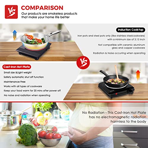 PORTABLE: Being small in size and light in weight, the compact design makes the burner consume little space, thus a perfect travel solution. Easy cleaning with wet cloth. It is an ideal choice in many places such as student dorms, offices, camping sites, RV and home. Cast-iron hot plate needs to be preheated for 10 minutes for best use, and it takes about 20 minutes for a hot plate to cool down, keeping the food warm longer. Please do not touch the burner body when in use.