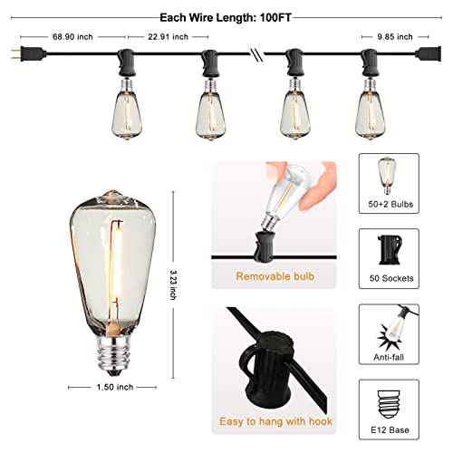 Specification: DAMAING LED Outdoor String Lights 100FT Waterproof Patio Lights with 52 Dimmable Edison Bulbs,Shatterproof Outside Hanging String Lights for Porch,Deck,Backyard, Balcony, Bistro,Cafe,2 Pack x 50Ft