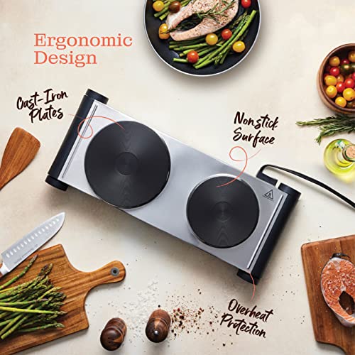 Electric Double Stovetop Hot Plate for Cooking 1800W 7.3/4″ Glass Cast Iron Portable Stove Burners Cool Touch Handle Cooktop Keeps Food Warm Temperature Controls Electric Burner for Kitchen, Dorm