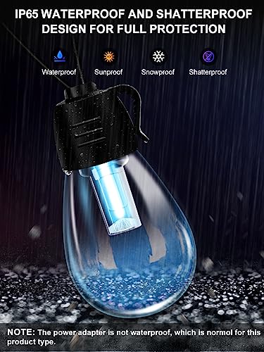IP65 Waterproof: Party lights enjoy year-round outdoor lights no matter the weather. Designed plastic waterproof outdoor decor bulb is also shatterproof to survive knocks and falls. Please note that power adapter is not waterproof.
