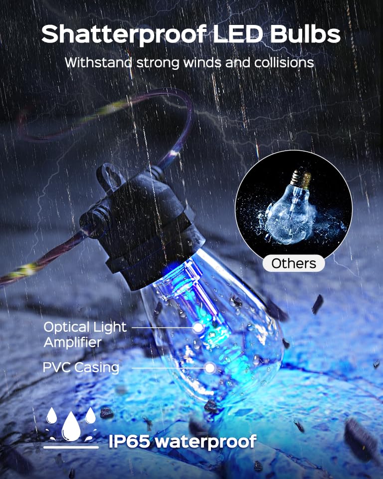 【Waterproof & Shatterproof LED Bulbs】IP65 Waterproof Rated. These patio lights will withstand all kinds of weather all year round. Shatterproof, even if dropped on the ground. An ideal option for outdoor and indoor lighting decorations.