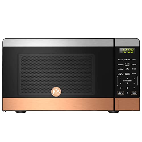This Joy Kitchen powerful 0.7 Cu. Ft, 700W compact microwave offers multi preset cooking menus: Popcorn, Potato, Pizza, Frozen dinner, Beverage, Reheat. The perfect balance of 0.7 Cu. Ft size fits perfectly in dorm rooms, offices and kitchens alike. For all frozen foods, defrost by time or weight, so you can enjoy more flavorful foods. Easy-to-control with express cooking function, one touch on LED display to turn on and will finish the cooking procedure automatically. Interior light for easy checking the working status without opening doors. Safety child lock prevents unsupervised Operation by children, avoiding accidental use or accessing by children. Stainless steel with Navy and rose gold housing design provides a pop of color to the kitchen while complementing any decor.