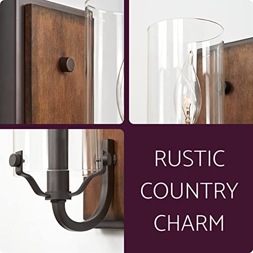 RUSTIC INSPIRED INDUSTRIAL FARMHOUSE: Classy oil rubbed bronze wall sconce is highlighted by an added wood backing in a walnut style finish and perfectly paired with cylinder glass shades. Bright lamp easily installs both up or down for added versatility