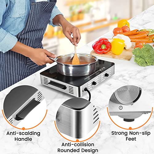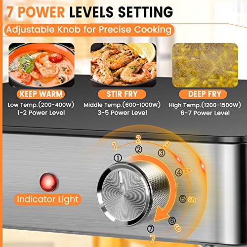 🍝【1500W Fast & Low Noise】Hot plates for cooking adopts infrared concentrated heating coil to ensure fast and low noise. Not only improve your cooking efficiency but also save more energy. 7 Power setting ranges from 200W to 1500W, and the adjustable knob control is convenient for cooking a variety of foods, such as simmer, deep fry, boil, sauté, sear, steam, slow cook and grill with ease.