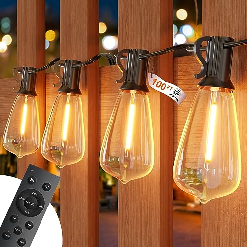 LaPitio 100FT Remote Outdoor String Lights for Outside, 2500K 52 LED Dimmable Bulbs, Waterproof Shatterproof Timer for Garden, Patio, Backyard, Yard, Gazebo, Deck, House Hanging Lighting