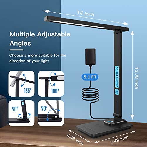 LED Desk Lamp with Wireless Charger, Desk Lamps for Home Office with 2 Night Lights & 5 Color Modes & 5 Brightness, 45 Min Auto Timer Desk Light with Clock, Alarm, Date, Temperature for College, Dorm
