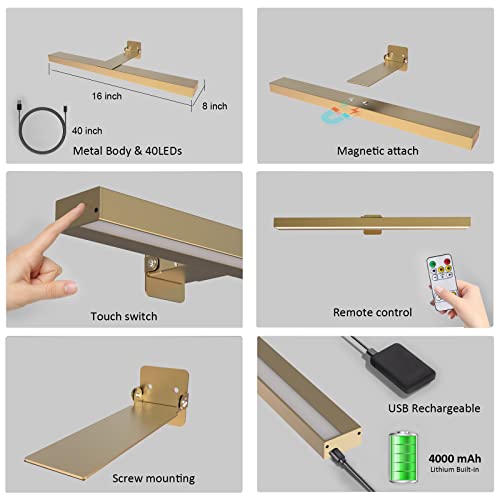 Specification: MIOBLUE Wireless Picture Lights with Remote, Recgargeable Battery Painting Light Display Lamp with 3 Lighting Modes, Dimmable Dartboard Light with Timer for Frame Portrait Art, Metal Body