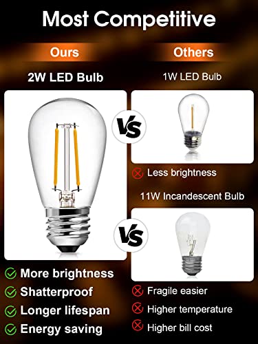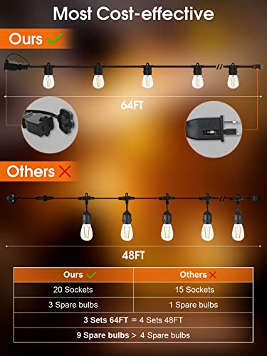 ✅ Long Enough Outdoor String Lights: 64ft with 23(3pcs spare bulb for replacement) S14 bulbs for 20 E26 sockets. The plastic bulbs are 2W 2700K with warm white light.