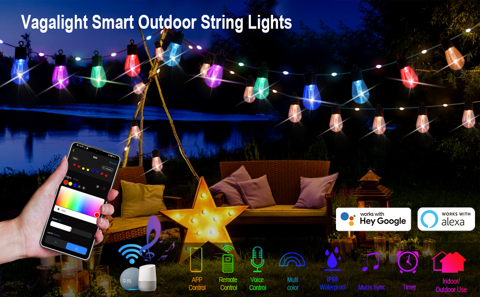 Customize your lights: Vagalight smart string lights contains 24 bulbs and 24 led beads, which allows you to effortlessly control each light’s color using “Smart Life” . With 8 pre-set modes and the ability to create your own custom modes, the possibilities for creating the perfect ambiance are endless.