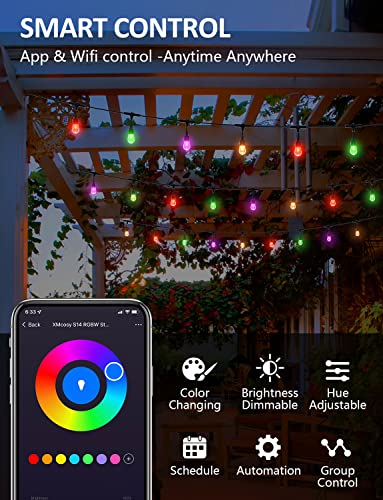 Specification: XMCOSY+ Outdoor String Lights, Smart 49Ft Patio Lights RGB, App & WiFi Control Color Changing LED String Lights with Dimmable 15 LED Bulbs, Works with Alexa, IP65 Waterproof, Shatterproof