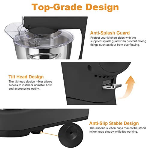 🧁TILT-HEAD & ANTI-SLIP DESIGN – The tilt-head design of the kitchen electric stand mixer allows easy installation or unloading of bowls and accessories. The dough hook, beater, and whisk are easily secured to the shaft, allowing you to cook easily and conveniently. The base of the food mixer is equipped with 2 powerful silicone suction cups, and non-slip silicone feet keep the cake mixer stable during work and avoid movement during operation.