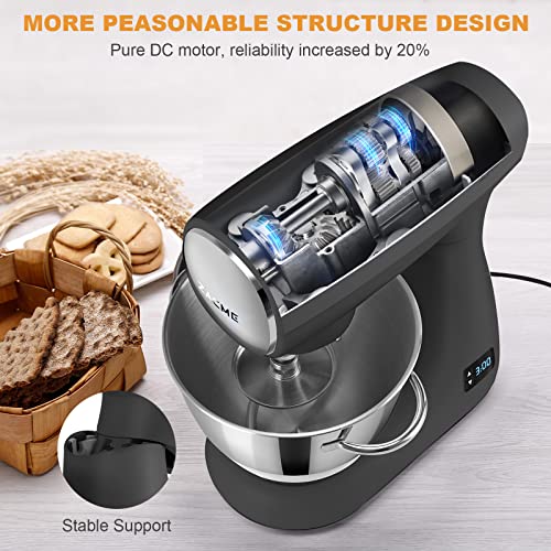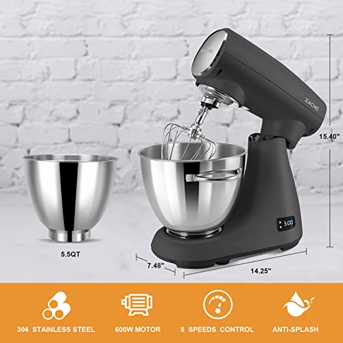 ZACME Mixers Kitchen Electric Stand Mixer, Aluminum die casting and Gears, 1 Hour Continuous Operation, Dual Cooling System, Low Noise DC Motor, LED Display and Timing Function, 600W 5.5QT, Food Grade